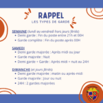 | Demi-garde de WE (samedi après-midi, dimanche ou jour férié) Demi-garde de nuit du lundi au vendredi en sus du service de garde normal |
