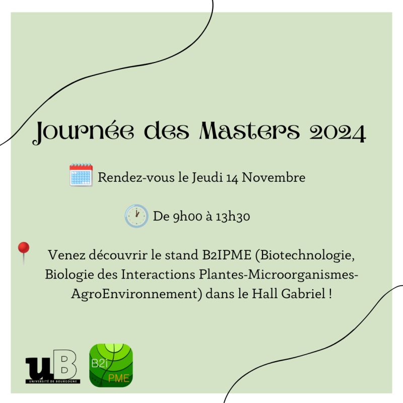 Venez rencontrer nos étudiants le 14 novembre de 9h à 13h au stand des B2IPME lors de la Journée des Masters (hall du Bâtiment Gabriel de l’université de Bourgogne)!
