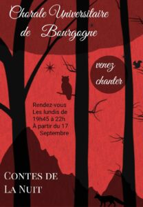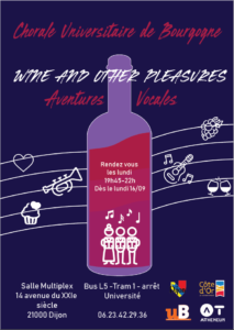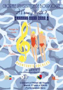 Depuis 2012, la Chorale Universitaire de Bourgogne a développé le projet Aventures Vocales. Le but : de mieux évoquer le travail que les choristes y effectuent. En effet, chaque année est l’occasion pour les choristes amateurs ou expérimentés de se former au chant. Et ceci grâce à notre chef de chœur, Frédérique Magnien, et à des intervenants occasionnels qui sont des professionnels de différents aspects de la technique vocale. Cette formation incite les choristes volontaires à s’engager dans des chants à un par voix ou des solis. Cette expérience leur donnent l’occasion de s’assumer et de progresser rapidement. D’autre part, ce travail de recherche vocale est poursuivi par l’élaboration d’une mise en espace adaptée qui favorise le chant et son interprétation. Cette dimension de recherche et de formation permet aux choristes de trouver une cohésion, qui permet à la fois l’efficacité et la convivialité. Yves Mory nous a accompagnés au piano jusqu’en 2021, puis Estelle Dattin, étudiante à l’école supérieur de musique de Dijon, nous accompagne jusqu’en juin 2024. Caroline Schmid a repris le flambeau depuis la rentrée 2024 et nous apporte sa riche expérience en Jazz, musiques traditionnelles du monde et en tant qu’enseignante de piano et accompagnatrice de chorales.