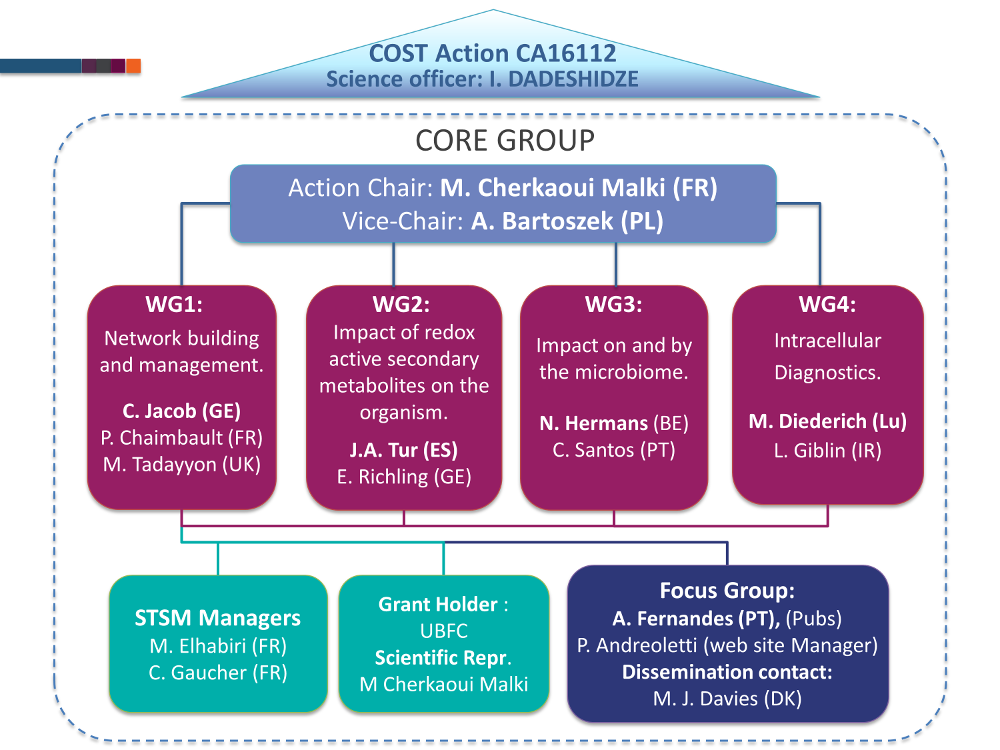 The main aim of the NutRedOx network is the gathering of experts from across Europe, including other Mediterranean countries, and from different disciplines that are involved in the study of biological redox active food components and are relevant to the ageing organism, its health, function and vulnerability to disease. Together, these experts will form a major and sustainable EU-wide cluster in form of the “NutRedOx Centre of Excellence” able to address the topic from different perspectives, with the long-term aim to provide a scientific basis for (improved) nutritional and lifestyle habits, to train the next generation of multidisciplinary researches in this field, to raise awareness of such habits among the wider population, and also to engage with Industry to develop age-adequate foods and medicines.
