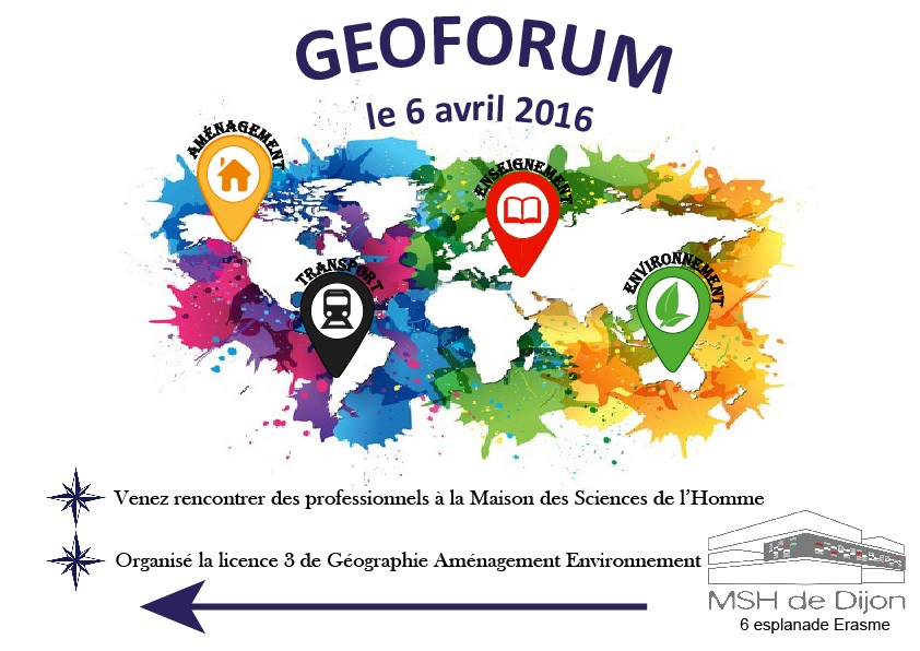 Le GEOFORUM 2016  aura lieu le 6 avril 2016 entre 9H et 16H à la MSH  http://msh-dijon.u-bourgogne.fr/accessibilite.html. La journée s’organise autour d’interviews de professionnels et d’ateliers permettant  les échanges entre intervenants et étudiants.