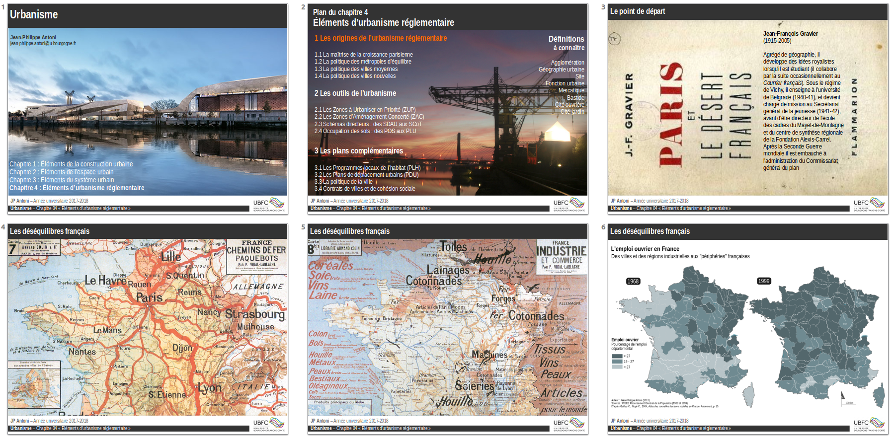 Ce cours vise à familiariser les étudiants avec le vocabulaire et les principales notions utiles à l’urbanisme, et plus généralement à l’étude de de la ville. Dans le premier chapitre, il se concentre la description physique des bâtiments (nécessairement tridimensionnels), dont la taille, la hauteur et l’architecture n’est pas indépendante des matériaux utilisés pour les construire (bois, pierre, béton, acier, etc.). Le deuxième chapitre s’intéresse ensuite à la disposition que peuvent prendre ces constructions les unes par rapport aux autres : il en résulte un tissu urbain (parcelles, îlots, bâti) et des espaces “en creux” (places et rues) qui génèrent une forme urbaine spécifique. Le troisième chapitre présente ensuite les liens supposés entre la forme urbaine et la manière de vivre en ville, en s’appuyant sur les principales utopies urbaines, entendues comme autant de visions idéalisés d’un couple “espace/société” unifié par l’urbanisme. Enfin, le quatrième chapitre retrace les problématiques qui ont conduit à la mise en place d’un urbanisme réglementaire dont les principaux documents de planification (SCoT, PLU) visent à construire et anticiper ces liens dans une vision prospective.