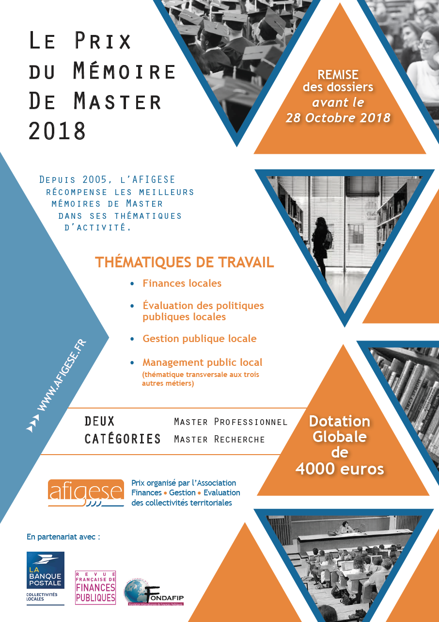 Lors de cette année 2018 se déroulera la onzième édition du Prix du Mémoire de Master, organisée par l’AFIGESE en partenariat avec la Banque Postale Collectivités Locales, l’Association pour la Fondation Internationale des Finances Publiques et la Revue Française des Finances Publiques.