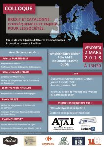 C’est pour tenter de comprendre ces enjeux actuels que le Master II Juriste d’Affaires Internationales, Promotion Laurence Ravillon, est heureux de vous convier à son Colloque sur la réimplantation des sociétés dans le contexte du Brexit et de la volonté d’indépendance de la Catalogne.