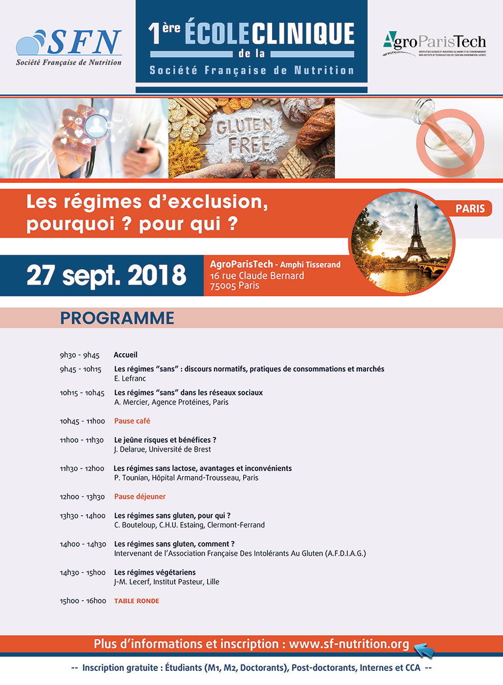 Dans le cadre de leurs enseignements de master 2, la promotion 2018/2019 se rendra à AgroParisTech le 27 septembre 2018 pour la première École Clinique de la Société Française de Nutrition.