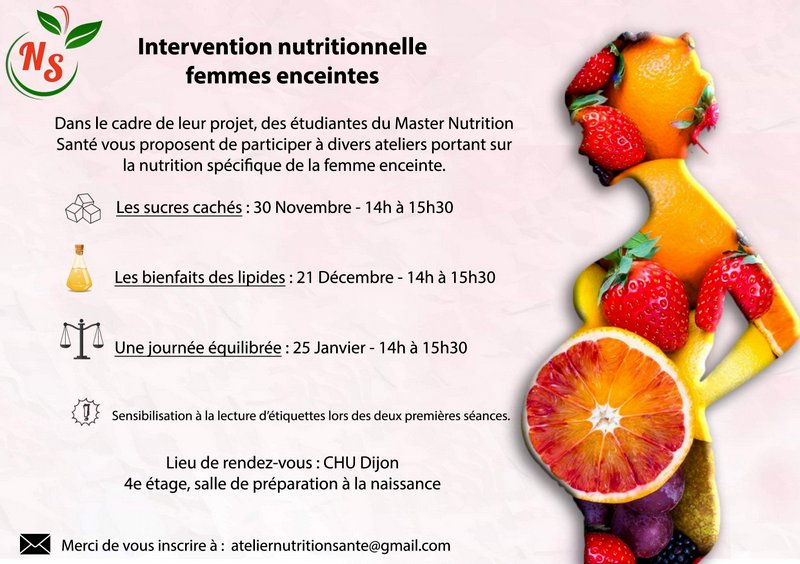 Dans le cadre de leur projet de terrain, cinq de nos étudiantes vous proposent de participer à divers ateliers portant sur la nutrition spécifique de la femme enceinte. Le premier volet portera sur les sucres cachés et se déroulera le vendredi 30 novembre de 14h à 15h30 au CHU de Dijon