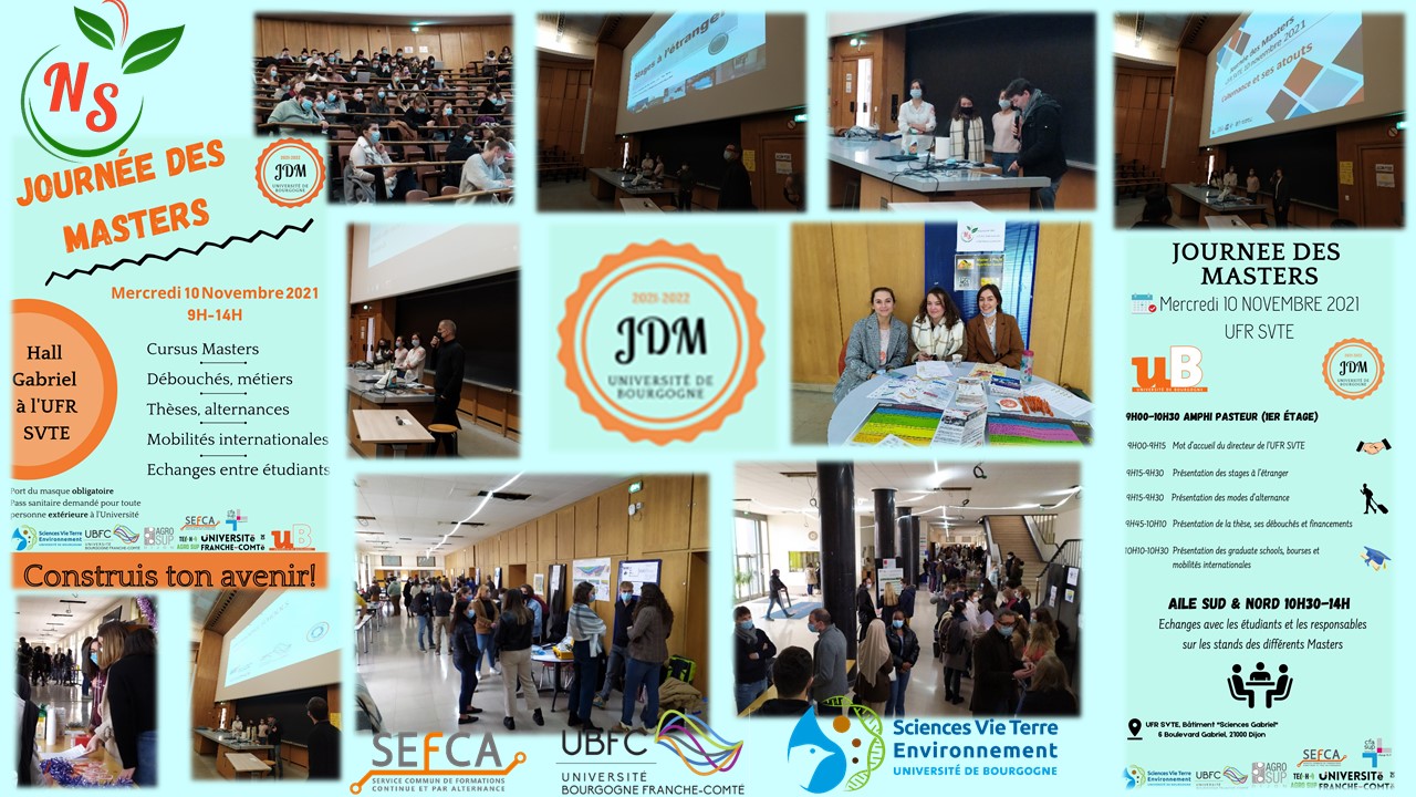 La Journée Des Masters s’est tenue le 10 novembre 2021. Les étudiantes de l’équipe communication du Master Nutrition Santé, présentes sur leur stand ont accueilli les étudiants de différents niveaux et parcours de licences et masters de l’UFR Sciences Vie Terre Environnement et ont répondu à leurs nombreuses questions.