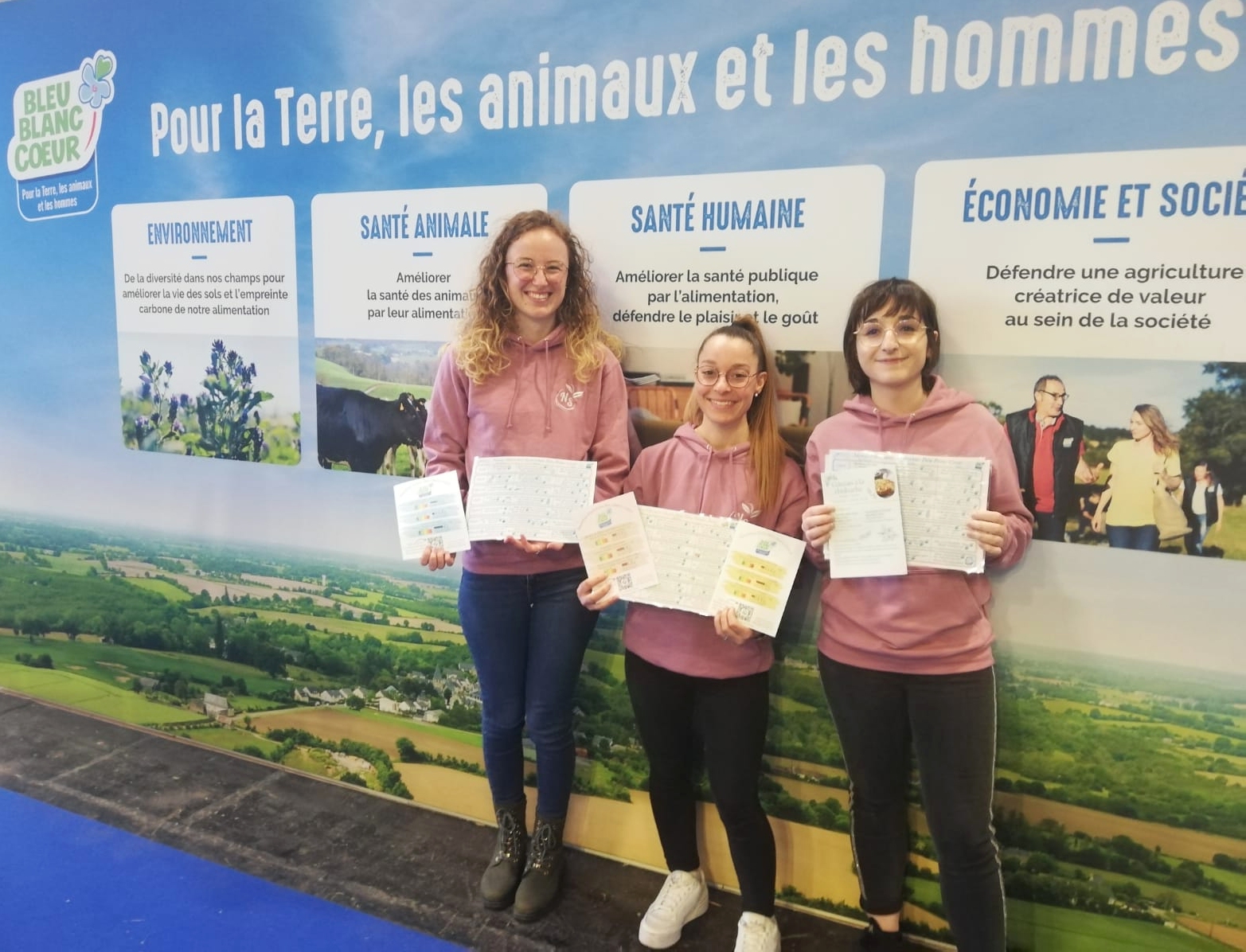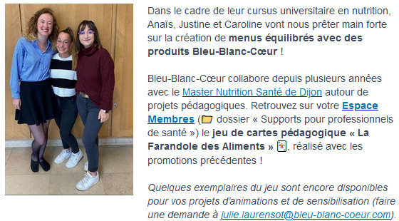 Cette année, Anaïs, Justine et Caroline ont comme projet de terrain de promouvoir la démarche “Bleu-Blanc-Cœur”. C’est un projet qui défend les valeurs du bien-manger, de l’écologie et du mieux vivre ensemble.