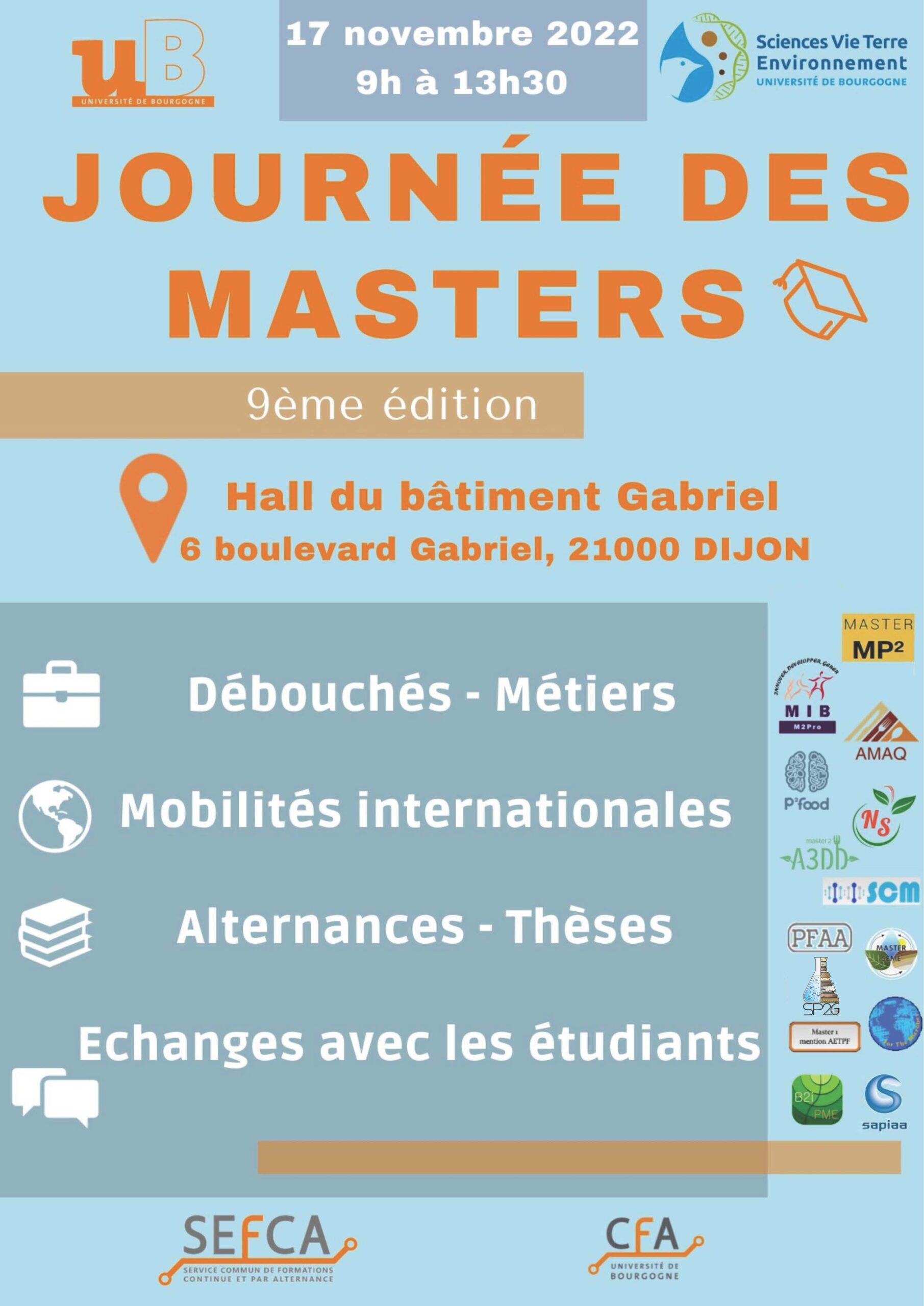 L’UFR SVTE de l’université de Bourgogne – Franche-Comté va une fois encore accueillir la Journée des Masters. Cet événement, porté par les étudiants du Master 2 Nutrition Santé dans le cadre du projet de terrain “Communication”, se déroulera le mercredi 10 novembre de 9h à 14h dans le hall du bâtiment Gabriel.
