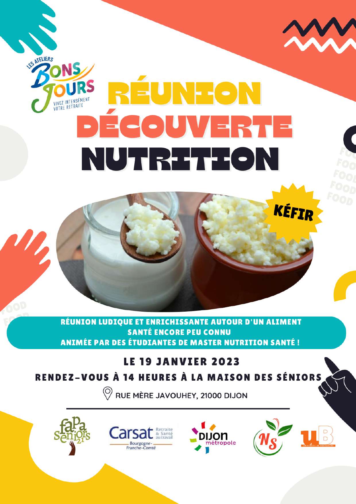 Grâce à une nouvelle collaboration avec la Carsat Bourgogne-Franche-Comté et FAPA Seniors 21, nos étudiantes ont l’opportunité d’intervenir le jeudi 19 janvier 2023 à 14h à la Maison des Séniors lors d’une réunion d’information à destination des seniors. L’objectif de cette présentation est d’apporter aux retraités de la région des informations de premier niveau sur la nutrition orientées autour des recommandations nutritionnelles en lien avec le programme national nutrition santé (PNNS).