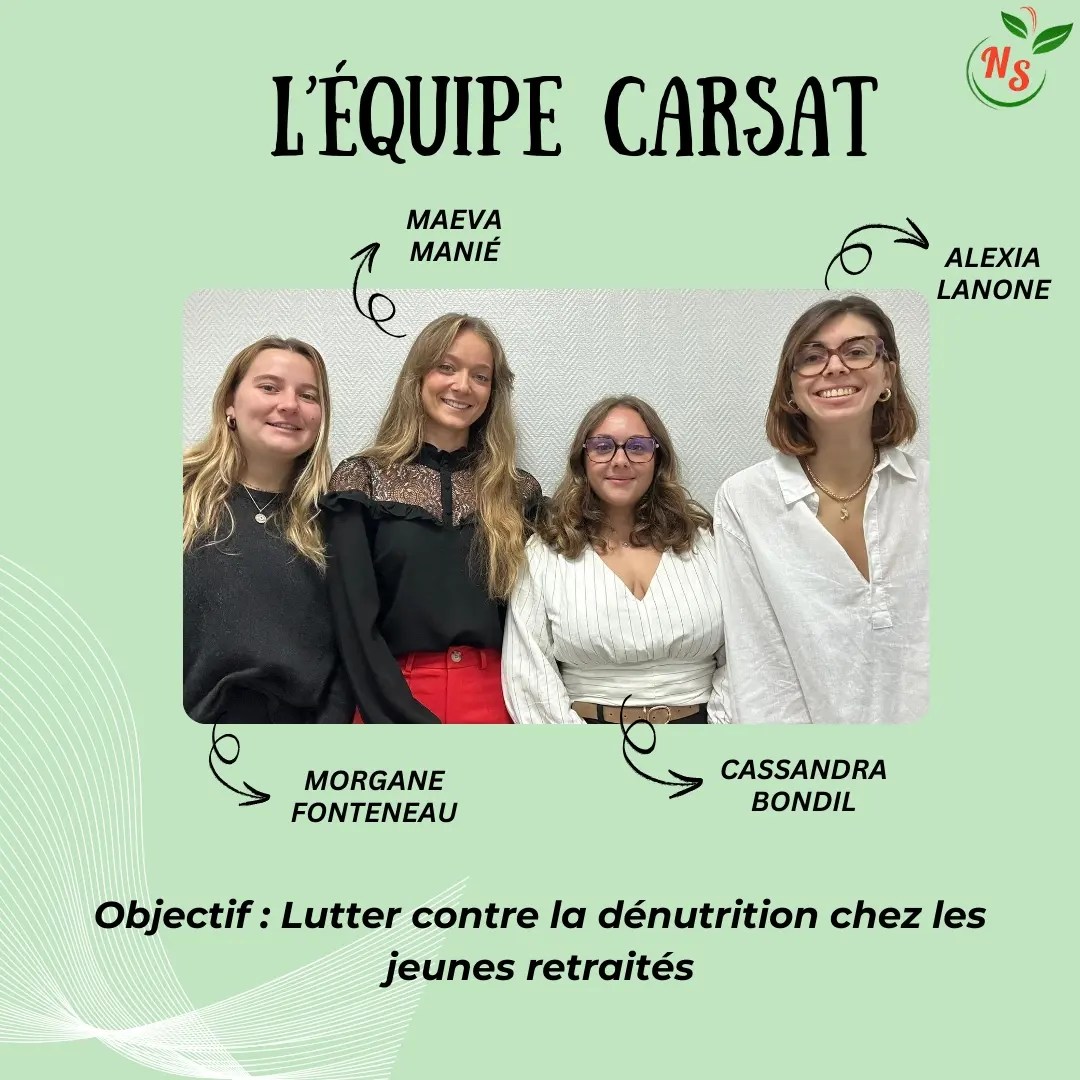 Dans le cadre de leur Master 2 Nutrition Santé, Morgane, Maèva, Cassandra et Alexia ont récemment partagé leur expertise avec l’organisme de la CARSAT, via un partenariat que nous avons maintenant depuis plusieurs années.