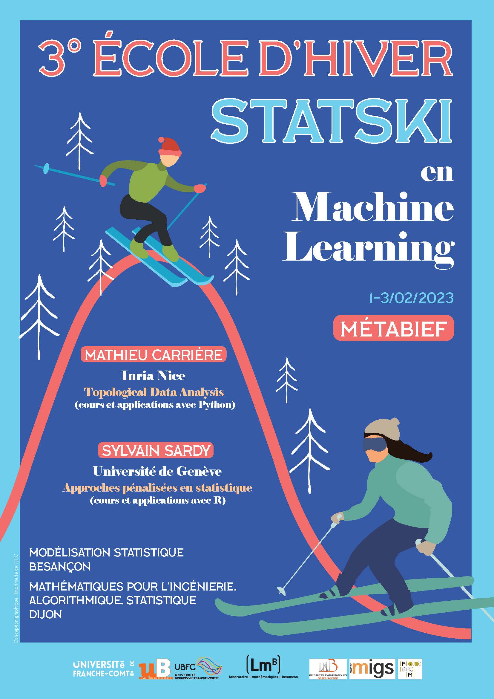 Organisée conjointement avec le Master « Modélisation Statistique » de l’Université de Franche Comté et soutenue par la Fédération de Recherche en Mathématiques BFC, cette « École d’hiver » est un moment clé de l’année : très riche d’échanges et de partages, elle est l’occasion de mettre en avant les travaux et réflexions dans un environnement convivial et propice à l’apprentissage !