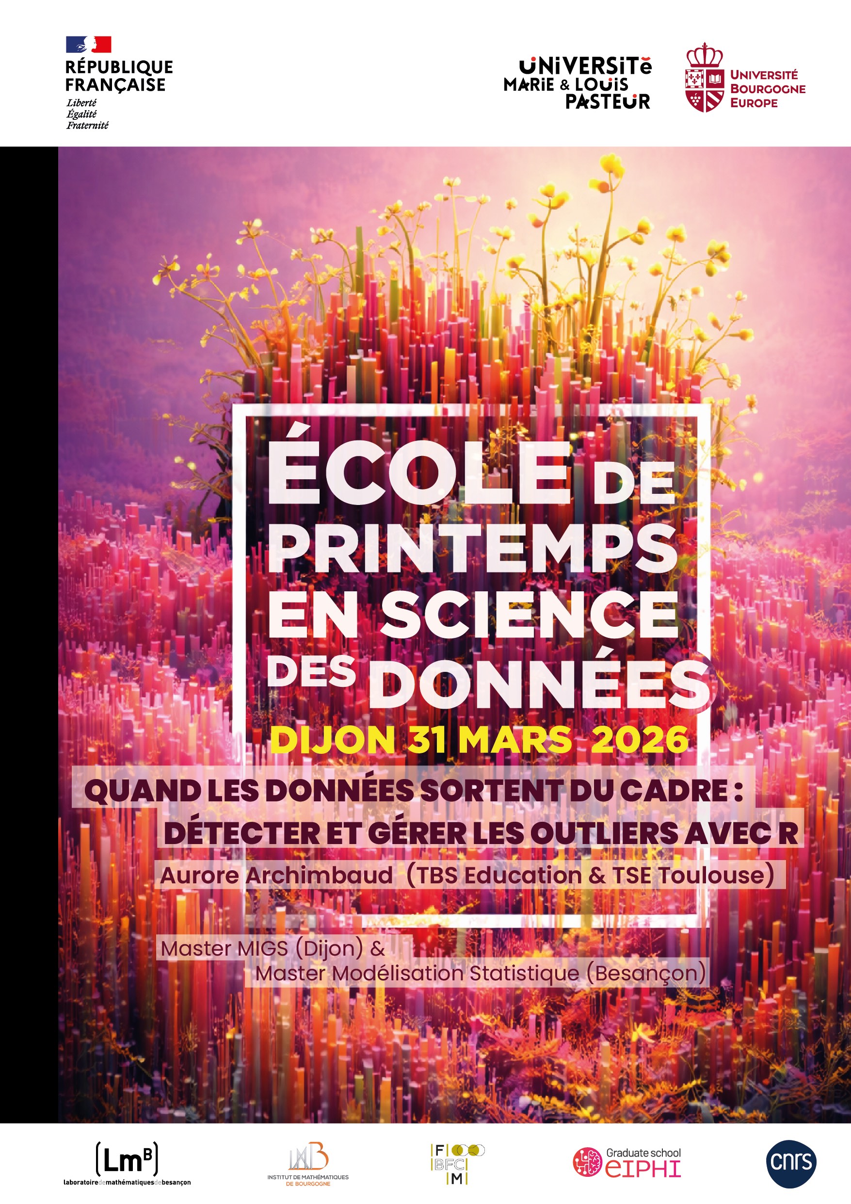 La deuxième édition de l’école de printemps en sciences des données des masters Migs de Dijon et modélisation statistique de Besançon est organisée le 31 mars 2026 à Dijon.