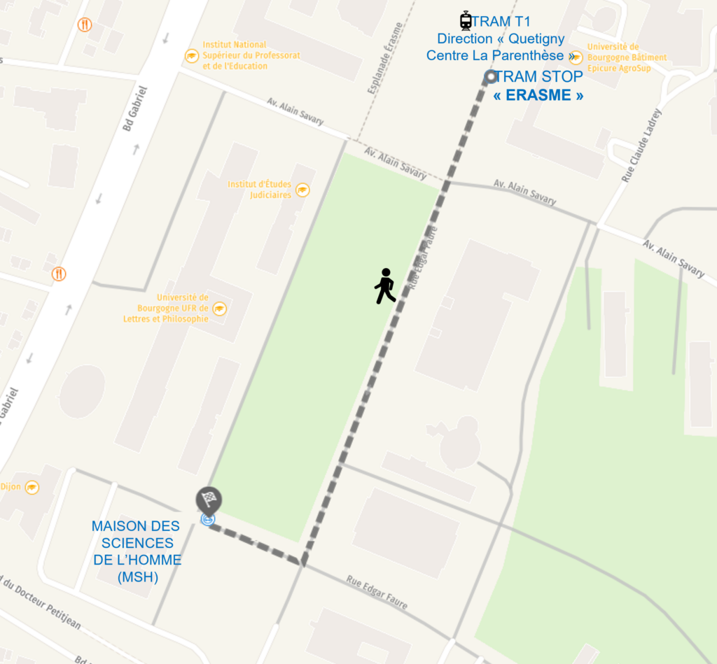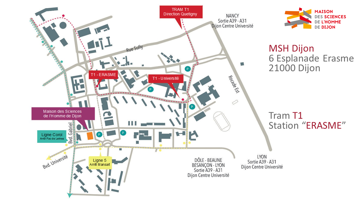 Access from Downtown Dijon : take Tram Line T1, in the direction of “Quetigny Centre la Parenthèse”. Get off at “ERASME” stop. The Maison des Sciences de l’Homme is just a 5-minute walk from there (see map for details).
