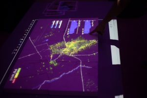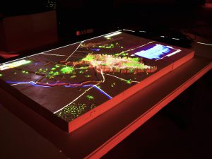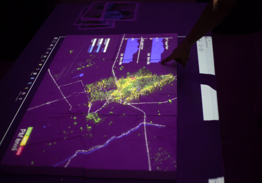 Pour relever le défi des dynamiques du trafic routier, il est possible d’observer les pulsations cardiaques d’un patient (la ville) par l’intermédiaire des électrodes (capteurs de comptages) disséminées dans la ville pour ensuite observer les impacts des véhicules sur l’air que nous respirons. Il est ainsi possible de placer la ville sous électrodes, nous donnant alors la possibilité de mieux représenter la dynamique du trafic routier. MarrakAir est un démonstrateur qui propose, à l’aide d’une tablette, d’interagir avec une maquette en 3D animée du quartier de Queliz à Marrakech. Ce laboratoire virtuel rend possible une modélisation de l’espace urbain afin de mieux observer les impacts environnementaux de différents types de véhicules (diesel/essence, scooter/automobile…) sur la qualité de l’airurbaine.